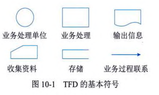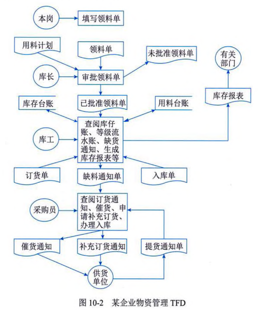 TFD 是分析和描述现有系统的传统工具,是业务流程调查结果的图形化表示。它反映现有系统各部门的业务处理过程和它们之间的业务分工与联系,以及连接各部门的物流、信息流的传递和流动关系,体现现有系统的边界、环境、输入、输出、处理和数据存储等内容。