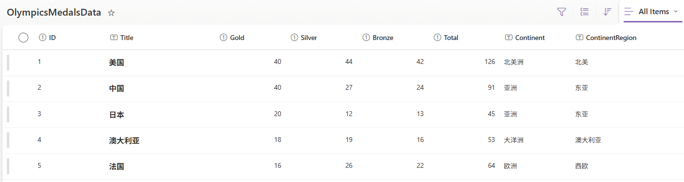 假定有一个SharePoint online list,存放了2024年巴黎奥运会奖牌数据,如下图,