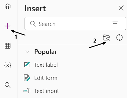 - 创建一个blank canvas app,然后点击左侧的添加组件按钮,同时点击右侧的Get more components按钮,如下图所示
