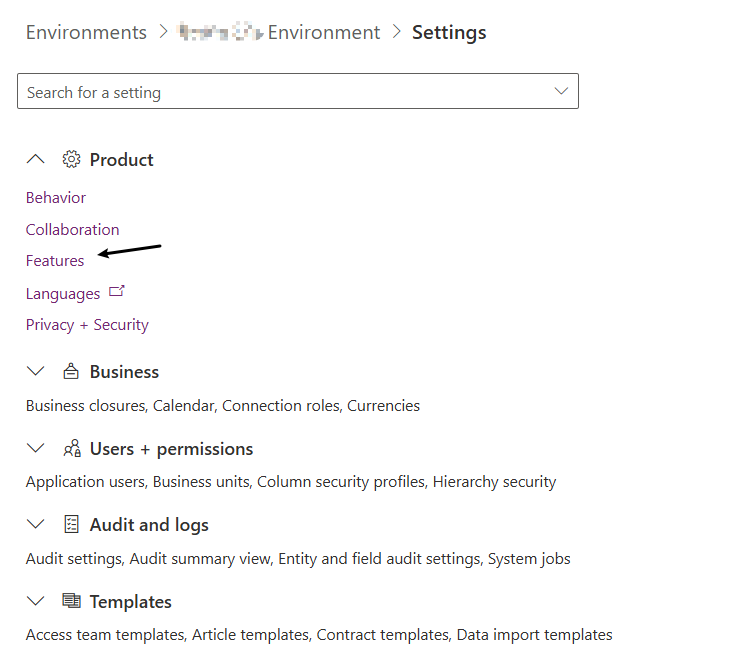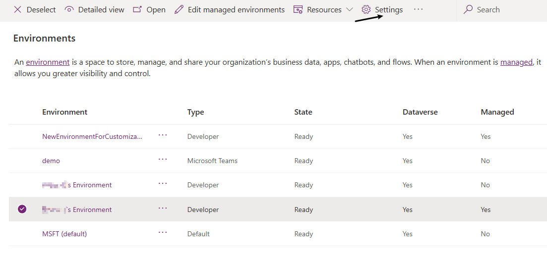 - 打开Power Platform admin center, 选择对应的environment,然后点击上方的Settings按钮,