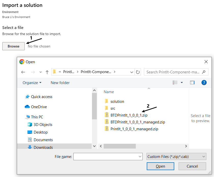 - 在 Import a solution 界面中,点击Browse按钮,选择打印solution的zip文件