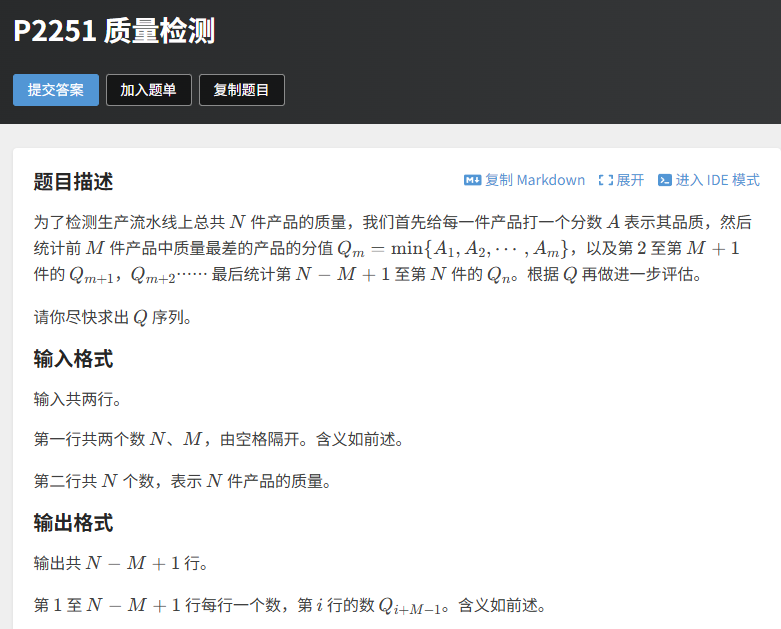 掌握了模板后,我们来看一道变形题 ------ 洛谷 P2251《质量检测》,这道题是 "滑动窗口最小值" 的直接应用,只是输出格式略有不同。