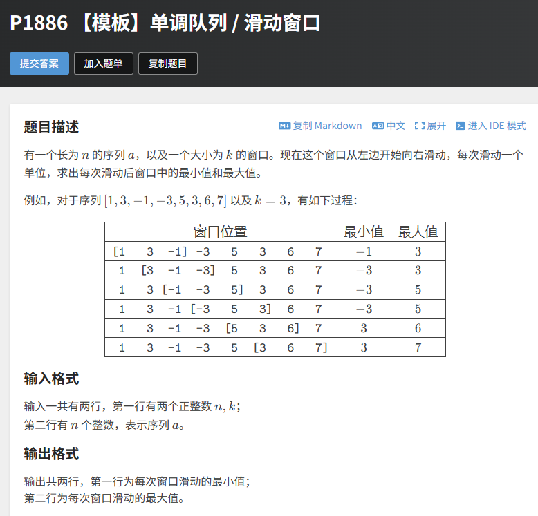 这是单调队列的入门必做题,题目要求同时输出滑动窗口的最小值和最大值。我们以此为例,编写完整的 C++ 代码,并详细注释。