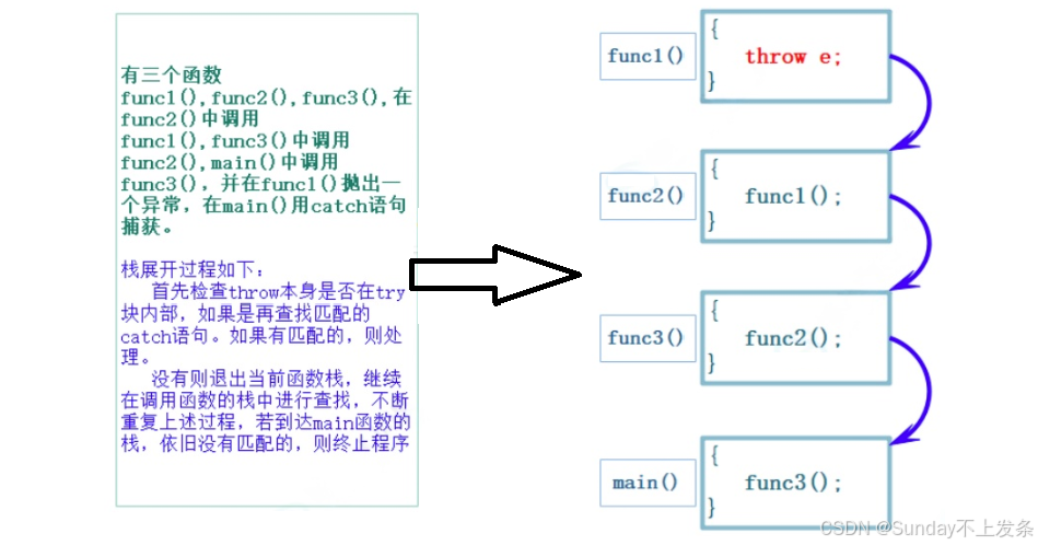 抛出异常后,throw后面的代码不再执行(当前函数的执行会立即中断),程序会寻找最近的 catch 块来捕获和处理该异常,如果当前的函数中没有catch或者没有与之匹配的catch,就会顺着函数的调用链继续寻找,直到找到匹配的catch。