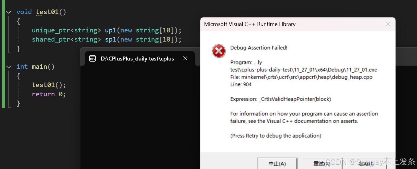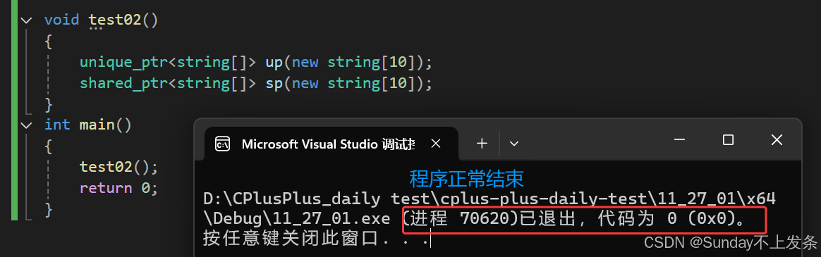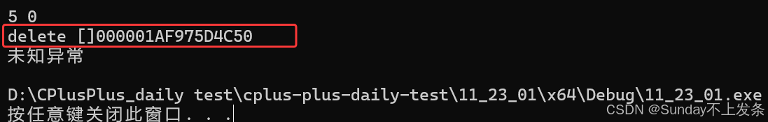 cppdouble Divide(int a, int b) { if (b == 0) throw "Division by zero condition!"; return (double)a / (double)b; } // 先捕获异常后并不处理异常,异常还是交给外层处理,这里捕获了再重新抛出去。 void solutionFunc() { // 如果上面的Divide函数抛异常,就不能将new的资源释放,导致内存泄漏 int* array = new int[10]; // 动态开辟内存 int len, time; try { cin >> len >> time; cout << Divide(len, time) << endl; } // 抛异常后先在函数内部捕捉异常,将new的资源释放后,重新将异常抛出,原来捕获到什么就抛出什么 catch (...) { // 捕获异常释放内存 cout << "delete []" << array << endl; delete[] array; throw; // 异常重新抛出,捕获到什么抛出什么 } } int main() { try { solutionFunc(); } catch (string e) { cout << e << endl; } catch (...) { cout << "未知异常" << endl; } return 0; }这确实算是一种解决方法,但是,如果有多次动态内存开辟时,在new的过程中抛一个异常出来,那就又是一个大坑了,还得用到我们下面的**RAII** 和智能指针。