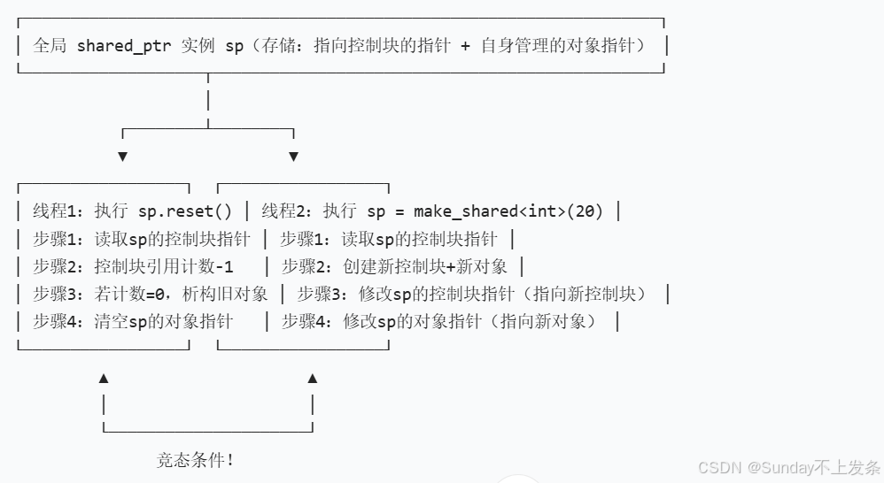 仅保证自身引用计数的线程安全,不保证其管理的对象(如sp指向的int对象)的线程安全。多个线程同时对一个shared_ptr对象管理的数据进行修改,就会引发数据的竞争,即shared_ptr对象到底是遵循你线程1的修改呢,还是遵顼你线程2的修改呢...