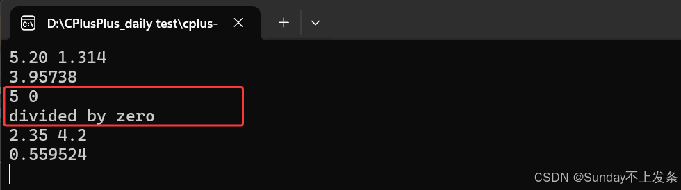 cppdouble divide(double x, double y) { if (y == 0) { string err{ "divided by zero" }; throw err; // 抛出异常,进行类型匹配,然后被对应的catch捕捉 } else return x / y; } int main() { while(1) { try { double x, y; cin >> x >> y; double ret = divide(x, y); cout << ret << endl; } catch (string err) { cout << err << endl; } catch (...) { cout << "未知原因" << endl; } } }可以看到,虽然在程序运行过程中出现了除以0这样的异常情况,但我们的程序并没有崩溃。