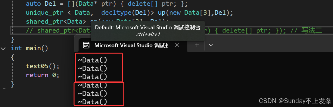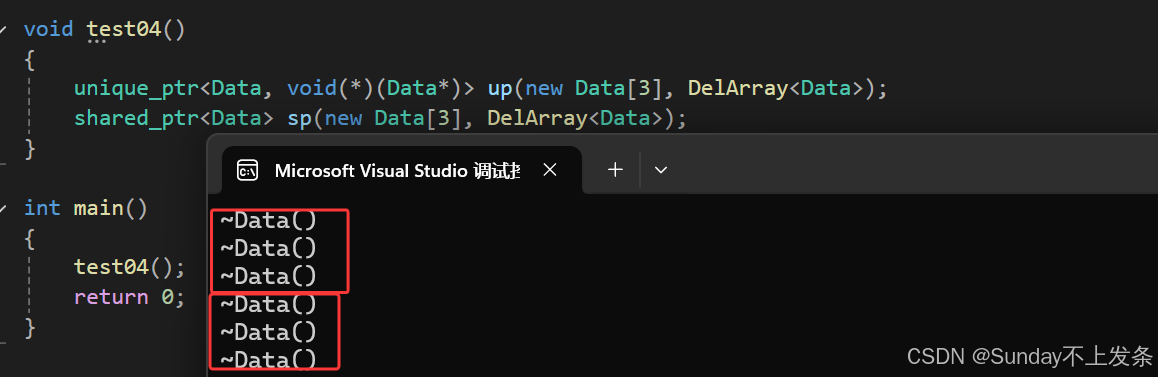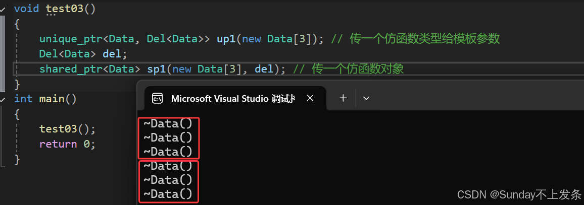 // shared_ptr<Data> sp(new Data[3], [](Data* ptr) { delete[] ptr; }); // 写法二