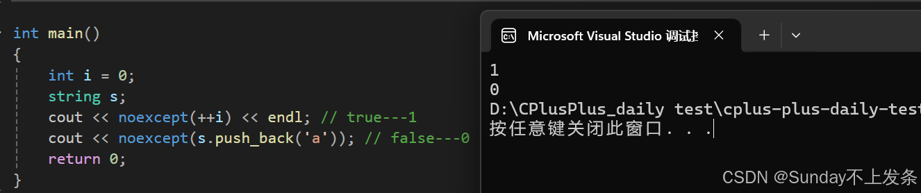 noexcept(expression)还可以作为一个运算符去检测一个表达式expression是否会抛出异常,可能会则返回 false,不会就返回true。
