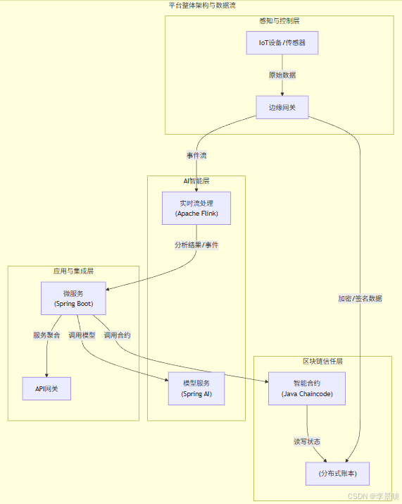 此层以 Spring Boot 为核心,构建面向具体业务场景的微服务。这些服务通过编排和调用下层(区块链、AI)的能力,实现完整的业务流程。