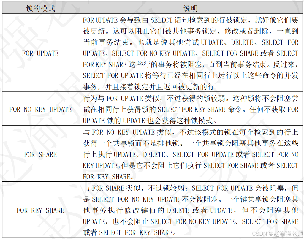 同一个事务可能会在相同的行上保持冲突的锁。但是除此之外,两个事务永远不可能在相同的行上持有冲突的锁。PostgreSQL行级锁不影响数据查询,它们只阻塞对同一行的写入者和加锁者。行级锁在事务结束时或保存点回滚的时候释放,就像表级锁一样。PostgreSQL行级锁支持以下四种不同的模式,如下表所示。