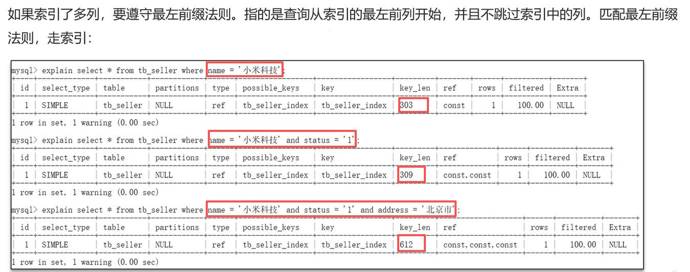 - 会遵守 最左前缀原则:从最左边字段开始,连续使用多少,就能利用多少索引。