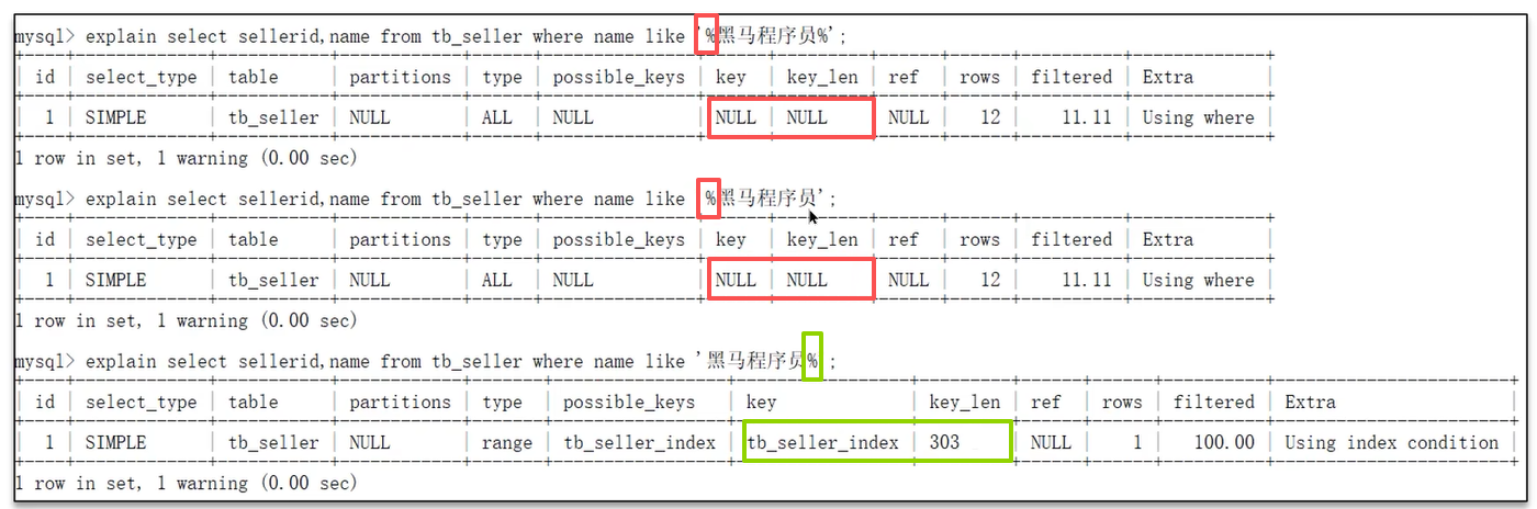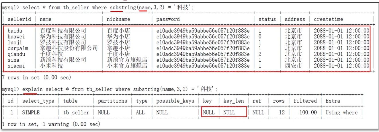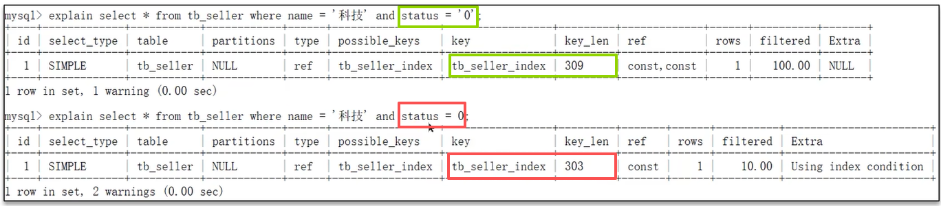 前两个字段 name 和 status 是走索引的,但是最后一个字段 address 没有走索引。