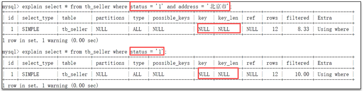 对 status 进行范围查询,所以 status 右边的列 address 不能使用索引。