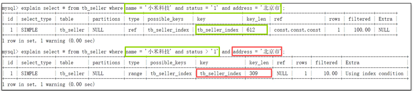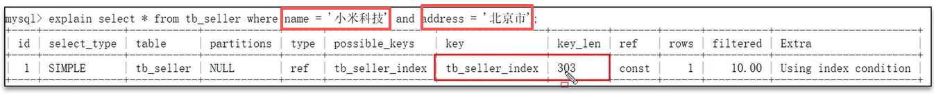 如果符合最左前缀法则,但是跳跃了其中某一列,则只有最左索引 name 会生效,导致 address 索引失效: