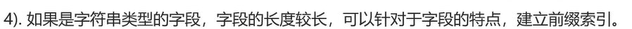 - 对于长字符字段,比如文章标题、商品名称等,我们可以++只对这些字段的前缀部分建立索引++ ,这就是**++前缀索引++**,可以减少索引的存储空间。