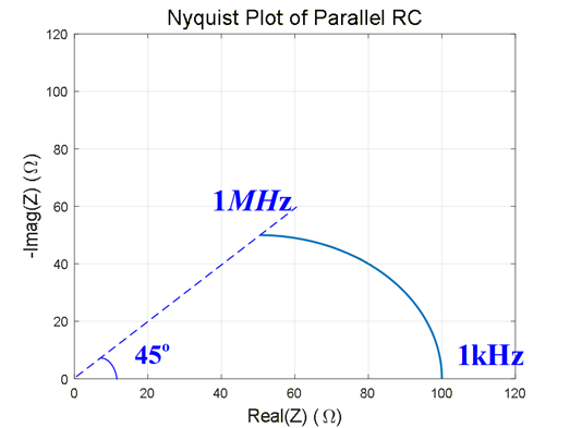 对于Nyquist图来说,是一个半径为R/2 的半圆 ,C在这里对半圆的形状没有影响,影响是曲线弯曲的快慢,转折频率ω =1/T ,此时相角特性为 -45 ° ,如果C 很小,需要在很高的频率下才会起到作用 ,呈现出类似半圆的形状,在低频下,C可以看作断路 ,所以在Nyquist上始终是一个点。比如,我们绘制RC并联阻抗的Nyquist图,取R=100 Ω ,C=1.59nF ,此时转折频率为1MHz。