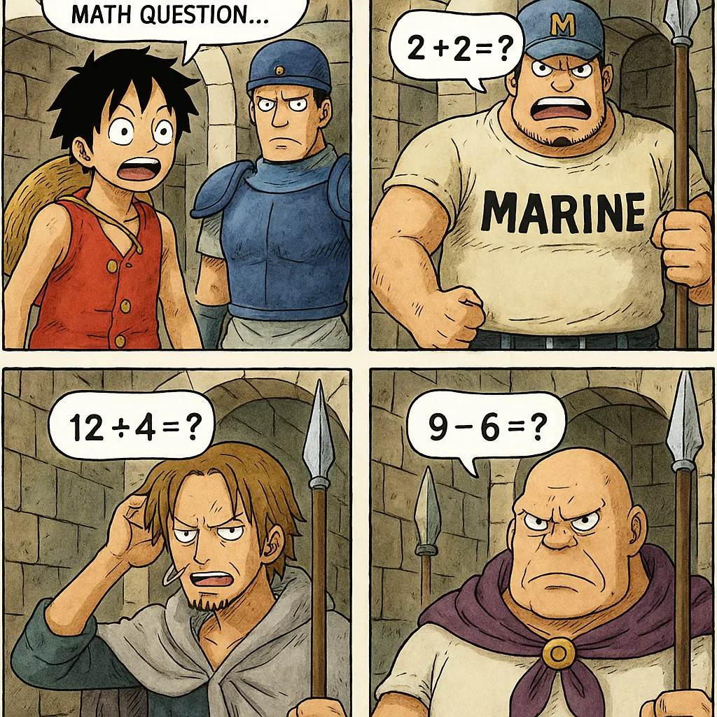 帮我生成图片:四格漫画,用动漫《海贼王》的风格,主题是一道数学题: