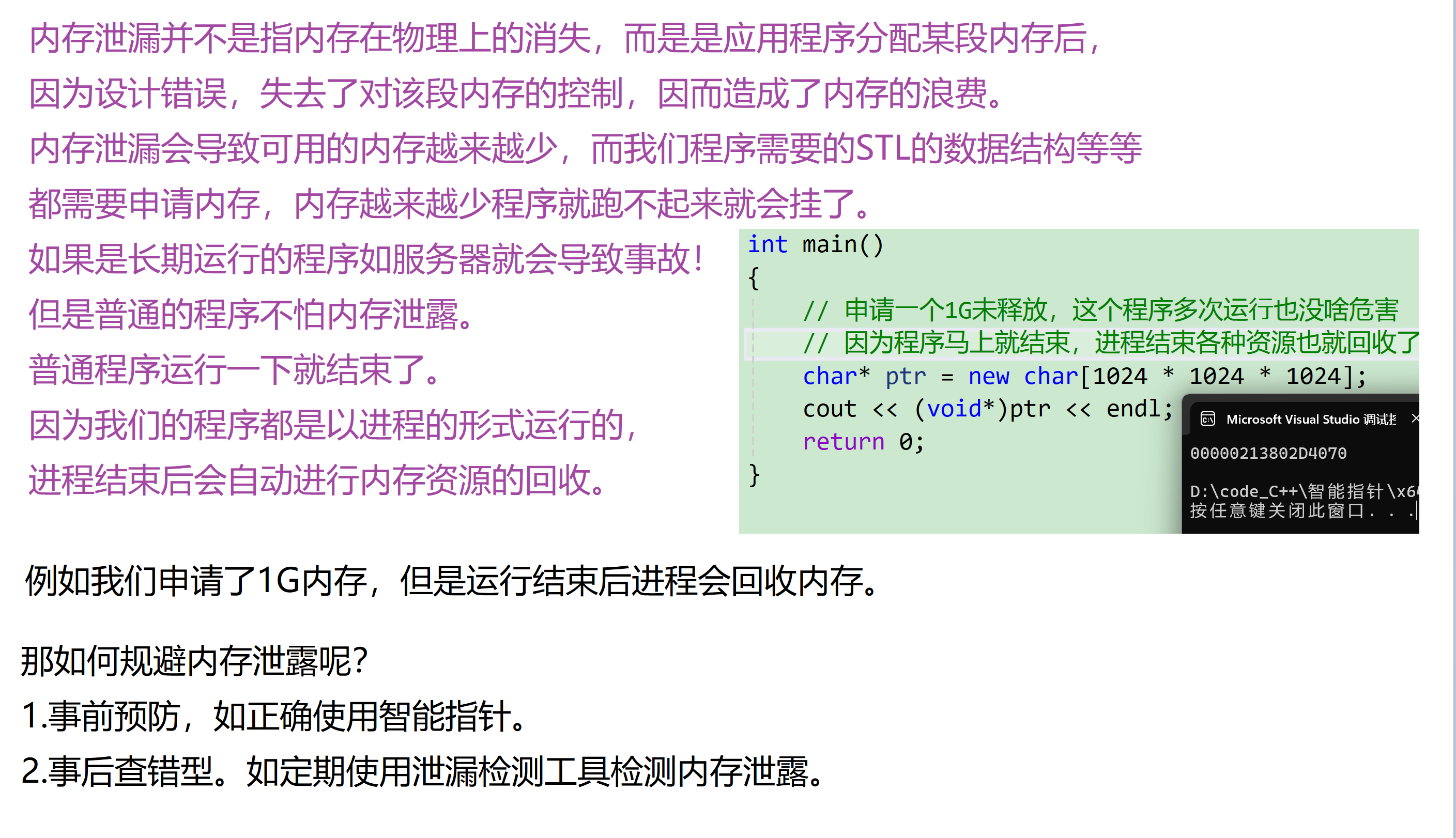 - 工程前期良好的设计规范,养成良好的编码规范,申请的内存空间记着匹配的去释放。ps:这个理想状态。但是如果碰上异常时,就算注意释放了,还是可能会出问题。需要下⼀条智能指针来管理才有保证。