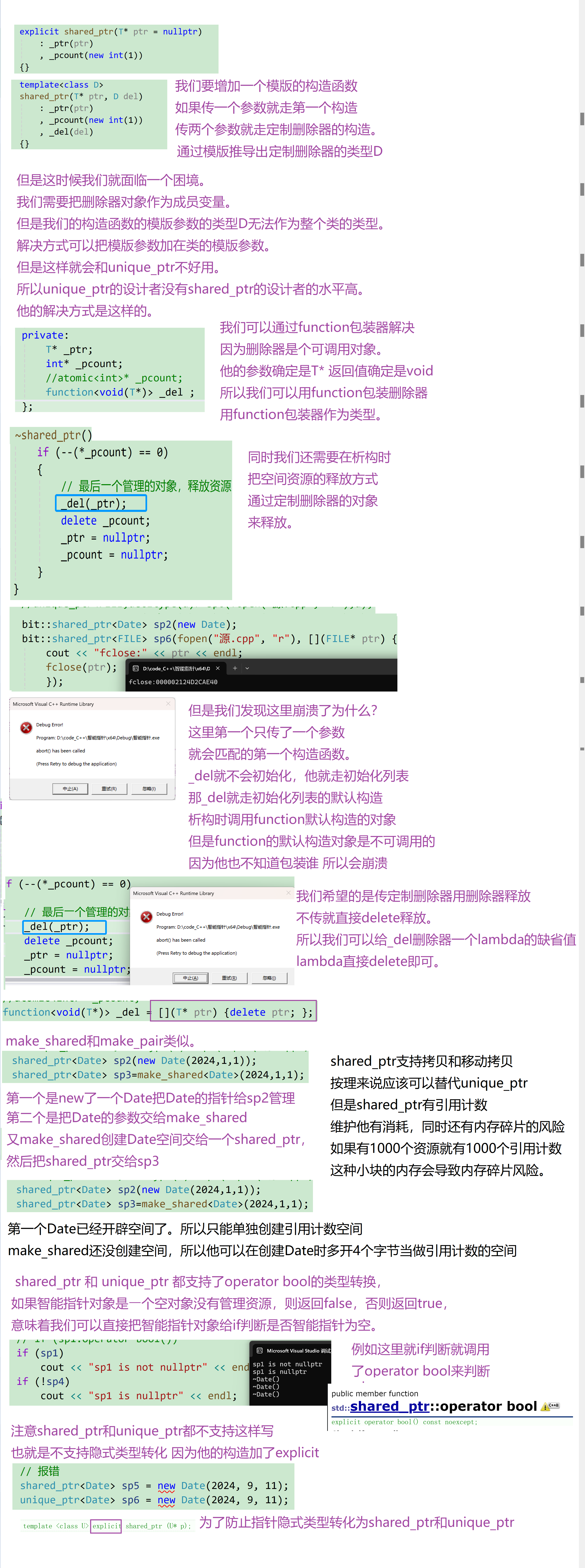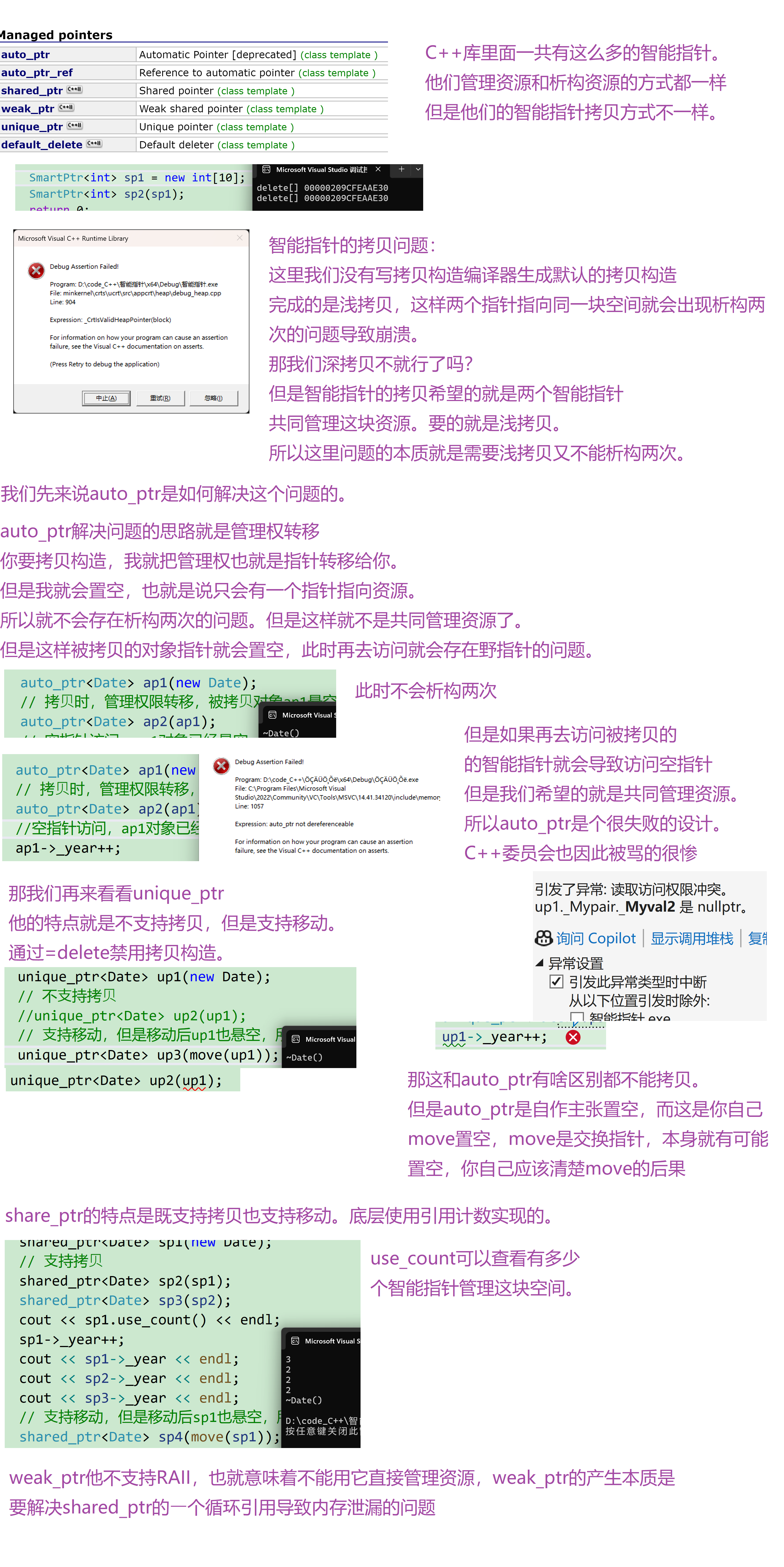 - 智能指针类除了满足RAII的设计思路,还要方便资源的访问,所以智能指针类还会像迭代器类⼀样,重载 operator*/operator->/operator[] 等运算符,方便访问资源。