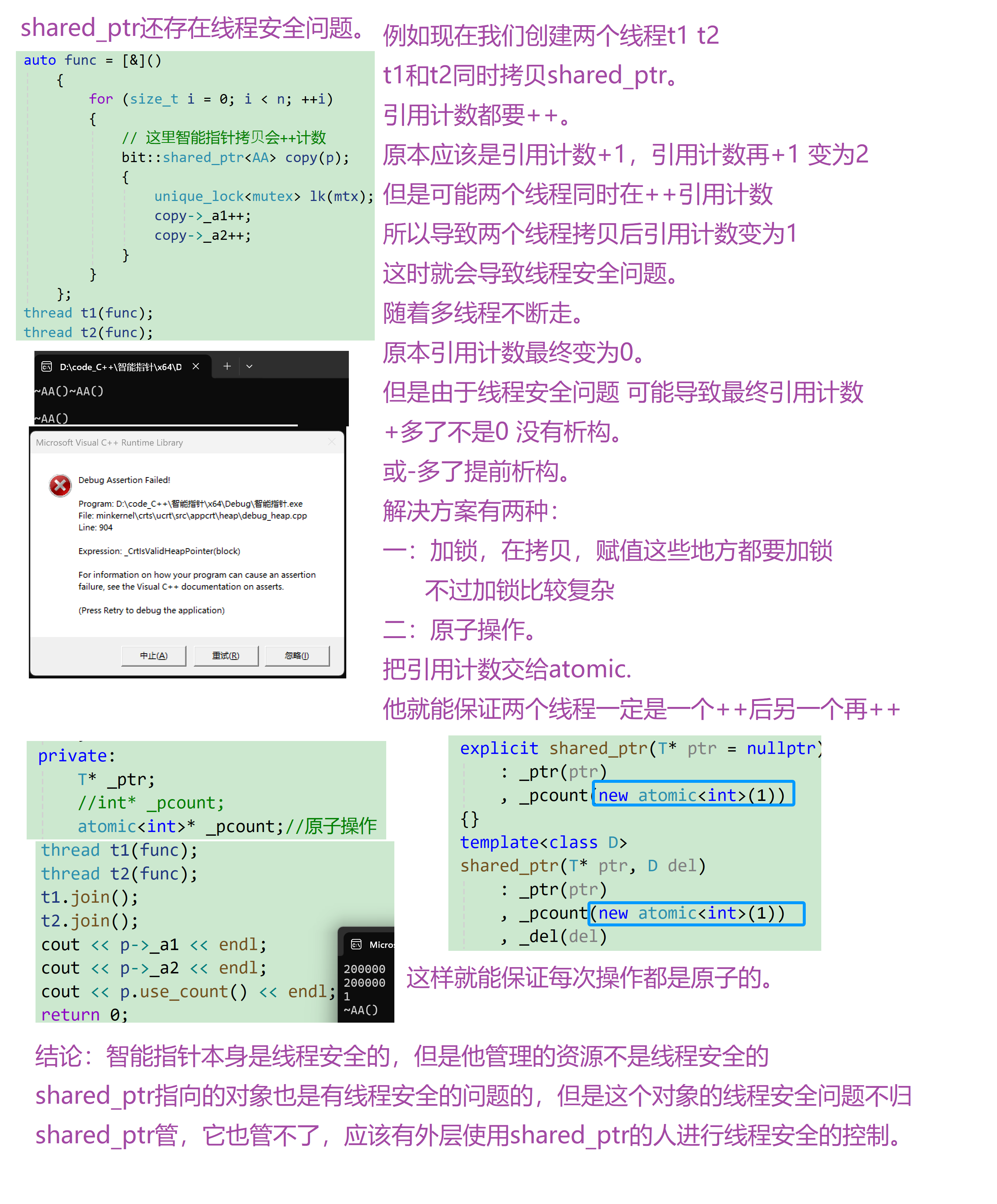 - shared_ptr的引用计数对象在堆上,如果多个shared_ptr对象在多个线程中,进行shared_ptr的拷拷贝析构时会访问修改引用计数,就会存在线程安全问题,所以shared_ptr引用计数是需要加锁或者原子操作保证线程安全的。