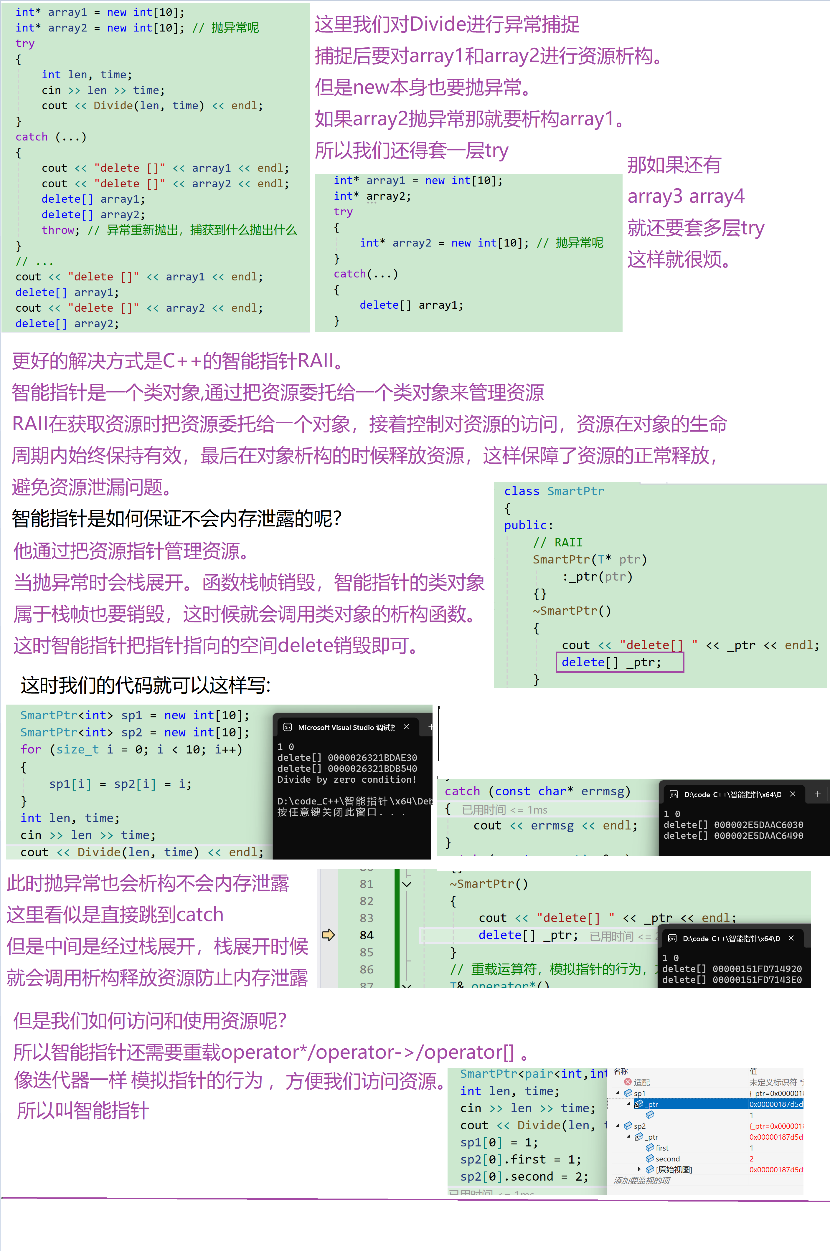 cpp#include<iostream> using namespace std; double Divide(int a, int b) { // 当b == 0时抛出异常 if (b == 0) { throw "Divide by zero condition!"; } else { return (double)a / (double)b; } } void Func() { // 这⾥可以看到如果发⽣除0错误抛出异常,另外下⾯的array和array2没有得到释放。 // 所以这⾥捕获异常后并不处理异常,异常还是交给外⾯处理,这⾥捕获了再重新抛出去。 // 但是如果array2new的时候抛异常呢,就还需要套⼀层捕获释放逻辑,这⾥更好解决⽅案 // 是智能指针,否则代码太戳了 int* array1 = new int[10]; int* array2 = new int[10]; // 抛异常呢 try { int len, time; cin >> len >> time; cout << Divide(len, time) << endl; } catch (...) { cout << "delete []" << array1 << endl; cout << "delete []" << array2 << endl; delete[] array1; delete[] array2; throw; // 异常重新抛出,捕获到什么抛出什么 } // ... cout << "delete []" << array1 << endl; delete[] array1; cout << "delete []" << array2 << endl; delete[] array2; } int main() { try { Func(); } catch (const char* errmsg) { cout << errmsg << endl; } catch (const exception& e) { cout << e.what() << endl; } catch (...) { cout << "未知异常" << endl; } return 0; }