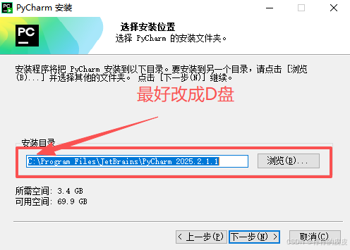 - 选择安装目录,建议避开 C 盘系统盘(如 D:\Program Files\JetBrains\PyCharm),路径中不要包含中文字符,选好后点击 "Next"。