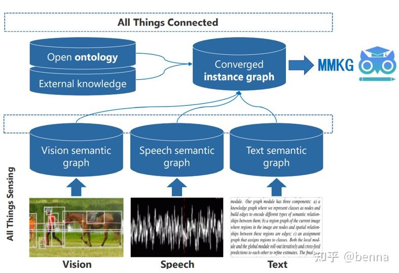 现有的知识图谱大多是用纯符号表示的,以文本的形式表示,这削弱了机器对现实世界的描述和理解能力,例如,在关系提取任务中,额外的图像通常会大大提高提取符号和文本中那些在视觉上很明显但难以识别的属性和关系的性能,例如:我们在描述一个网络架构的时候,文字往往比较匮乏单调,而一个直观的网络架构图会让人一目了然,我们也会通过多模态的知识来培养机器学习到这种进行网络组网和架构设计的能力。
