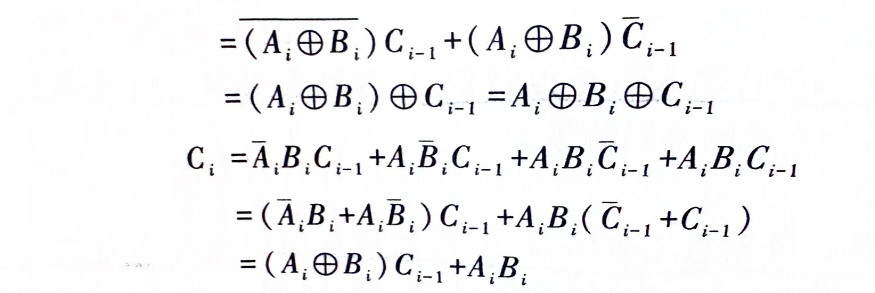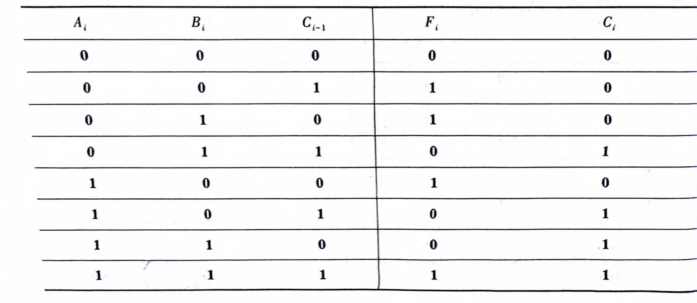 全加器是一种将低位来的进位数连同本位的两个二进制数三者一起求和的组合电路。根据这一逻辑功能列出的真值表如下。Ai和Bi是本位的二进制数,Ci-1是来自低位的进位数,Fi是相加后得到的本位数,Ci是相加后得到的进位数。