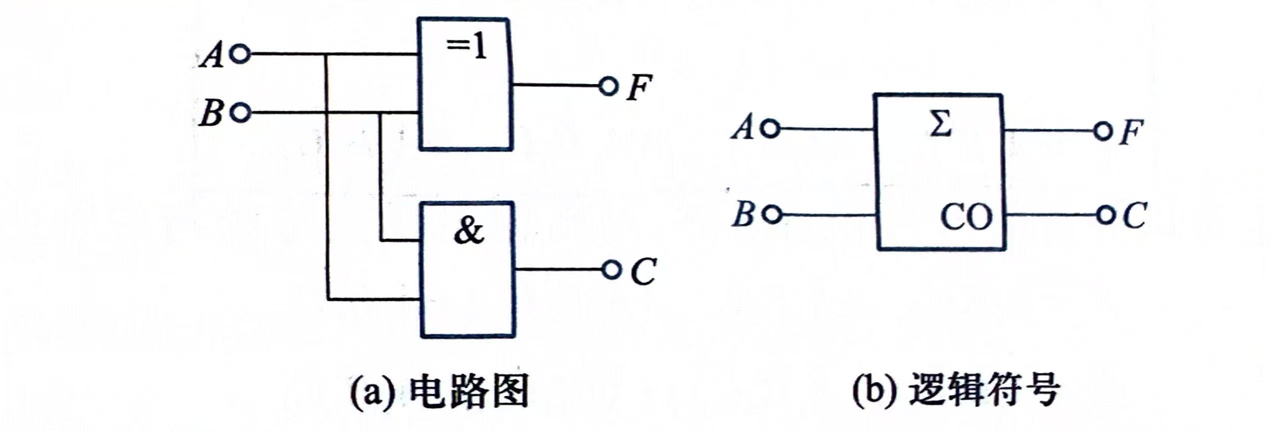 由上述真值表可以看出A和B相同时F为0,A和B不同时F为1,这是异或门的逻辑关系。只有A和B都为1时C才为1,这是与门的逻辑关系。所以半加器是由一个异或门和一个与门组成,半加器电路和逻辑符号如下