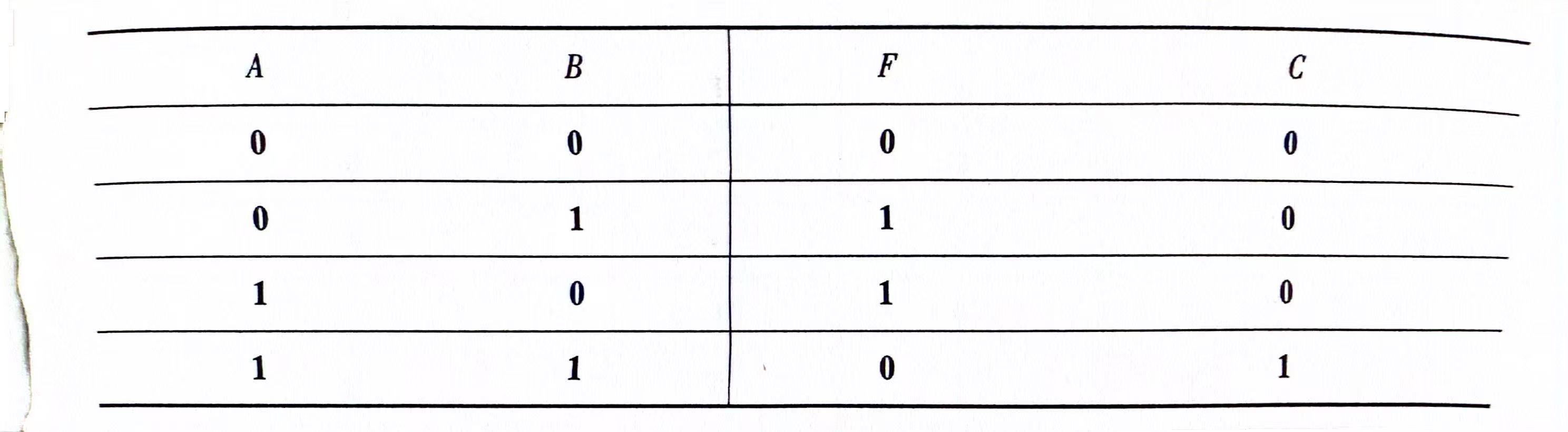 半加器是一种不考虑低位来的进位数,只能对本位上的两个二进制数求和的组合电路。其真值表如下,A,B是两个求和的二进制数,F是相加后得到的本位数,C是相加后得到的进位数。