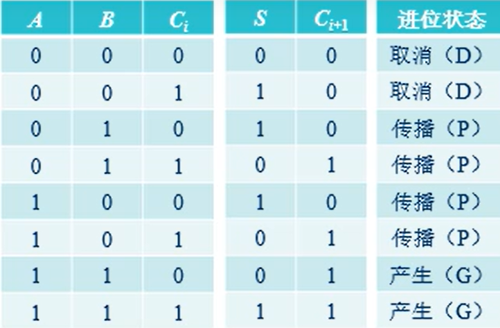 。第三个状态时进位传播状态,当A和B有一个为1时,这时是否进位需要看上一级进位数Ci,此时Ci+1完全与Ci一样,进位传播状态用P表示,