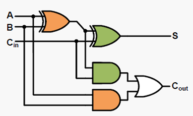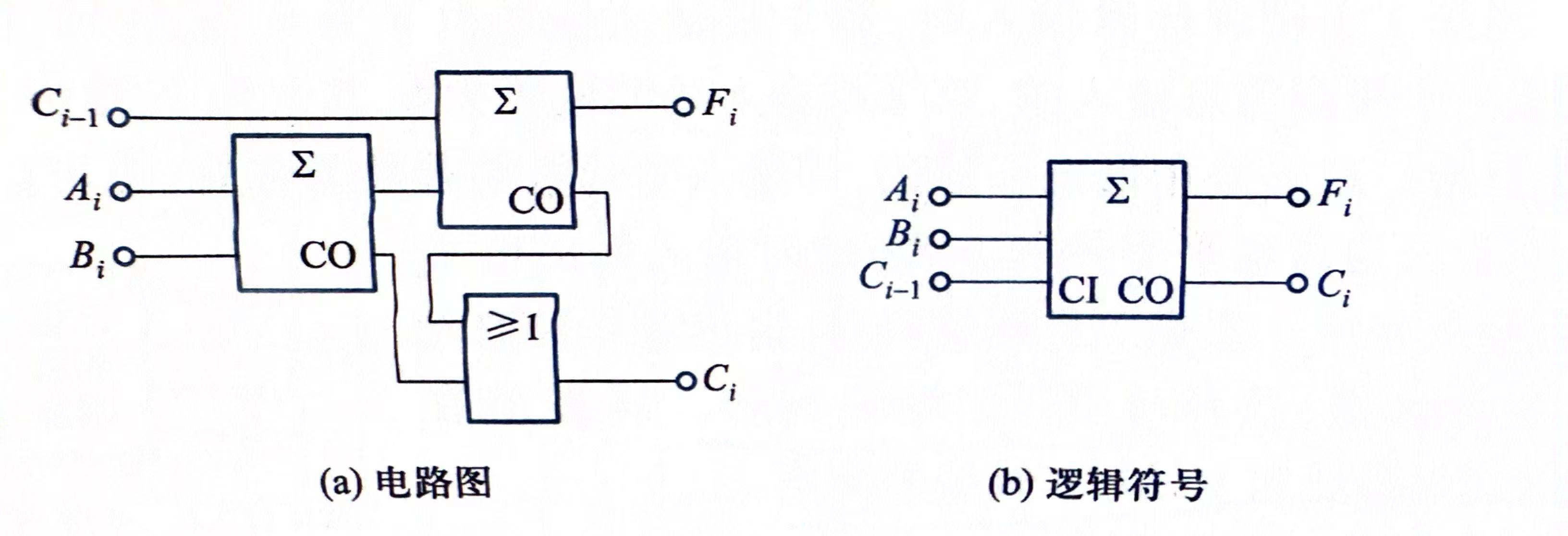 根据化简后的公式可以画出全加器电路即逻辑符号如下所示。以上是通过逻辑公式化简得到的结果。根据电路图也可以直观理解全加器,实际上就是当前位的Ai和Bi先相加(半加器),得到的当前位再与来自低位的进位数Ci-1相加得到最终的当前位Fi,所以当前位Fi上的计算就是三个数经过两个半加器计算得到的([(A+B)+C])。对于下一位Ci,要么是0要么是1,如果0的话代表Ai+Bi+Ci-1这三个数加起来都没有超过2,即没有进位,如果为1的话,意味着Ai+Bi(第一个半加器)或Ci-1+(Ai+Bi)(第二个半加器)中有一个半加器进位了,所以用或门来得到最后的进位数Ci