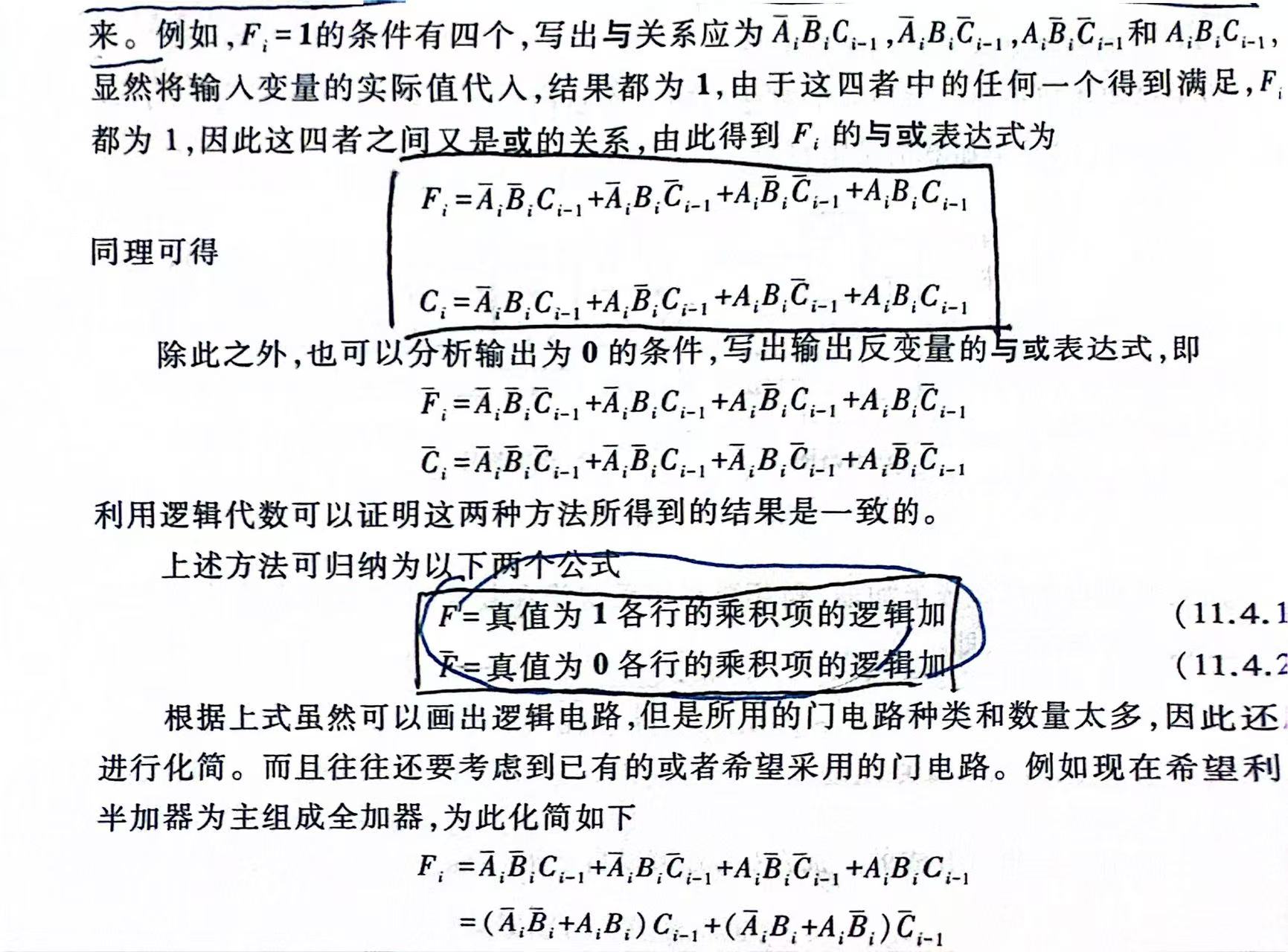 接下来根据真值表写出逻辑表达式,但是全加器不像半加器真值表那样一目了然。可采用如下方法:先分析输出为1的条件,将输出为1各行中的输入变量为1者取原变量,为0者取反变量,再将它们用与的关系写出来。