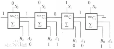 逐位进位的4位加法全加器如下图所示,它由4个全加器串联组成。如输入的被加数A为0101,加数B为1101,得和数S为(C3=1)0010(实际上结果应该是10010,只不过这里只写出了本位Fi,而最高位1为进位数)。这种加法器在进行任一位加法运算时,都必须等到比它低位的加法运算结束送来进位时才能进行。运算的进位,是从低位向高位以串形方式逐位进位。这种串行加法器电路虽然简单,由于最高位的运算一定要等到所有的低位运算都完成并送来进位信号时才能进行,运算速度慢,一般用于对运算速度要求不高的设备中。要求提高运行速度,应尽量缩短高位形成的全加和的时间,可选取超前进位全加器。