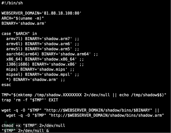 如图所示,该脚本会自动检测主机架构(ARM、MIPS或x86),并获取对应的恶意软件载荷以确保成功执行。
