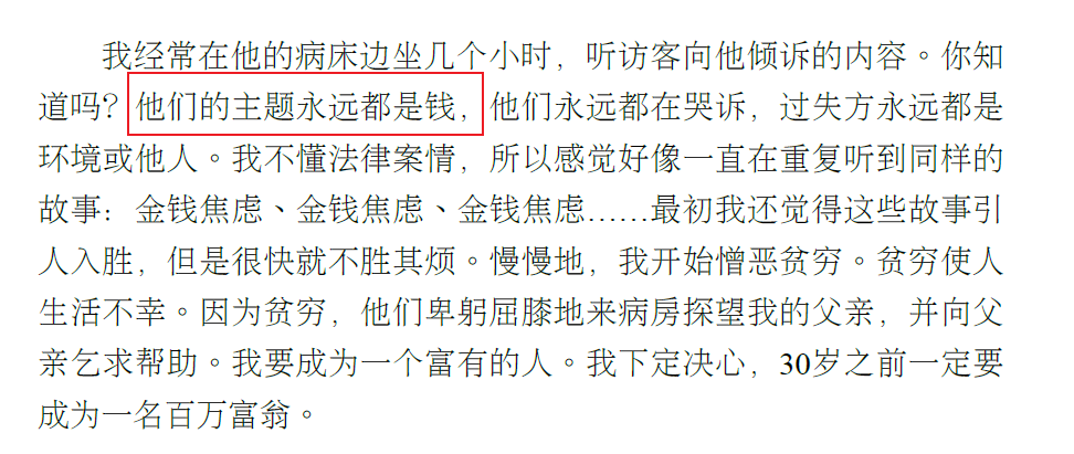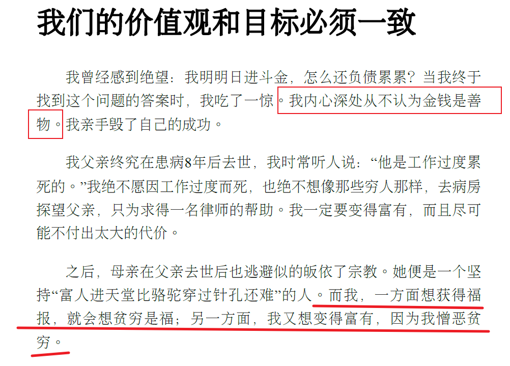 我内心深处不认为金钱是善物。这句话怎么理解 ???