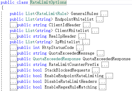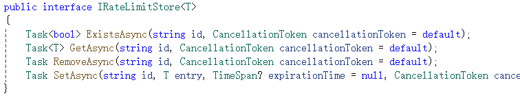 IpRateLimitOptions接口维护全局行为与通用规则,对应appsettings.json的IpRateLimiting配置,IIpPolicyStore接口维护特定IP或IP段的限流规则,对应appsettings.json的IpRateLimitPolicies配置。IpRateLimitOptions接口继承自RateLimitOptions类,其内的属性与appsettings.json的IpRateLimiting配置属性大致相同,可以参照之前的文章设置参数,而IIpPolicyStore接口继承自IRateLimitStore,需要调用GetAsync获取IpRateLimitPolicies策略对象,调整策略数据后再调用SetAsync保存IpRateLimitPolicies策略对象。