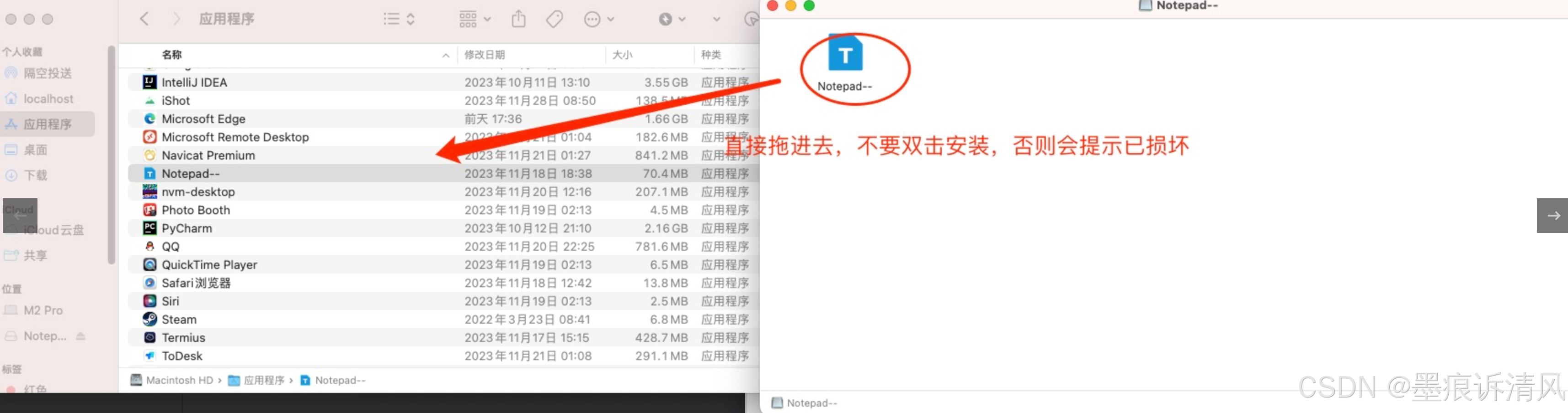- 首先安装时,打开安装界面不要双击安装,打开访达-找到应用程序,然后将Nodepad--直接拖进应用程序,这样就安装成功了
