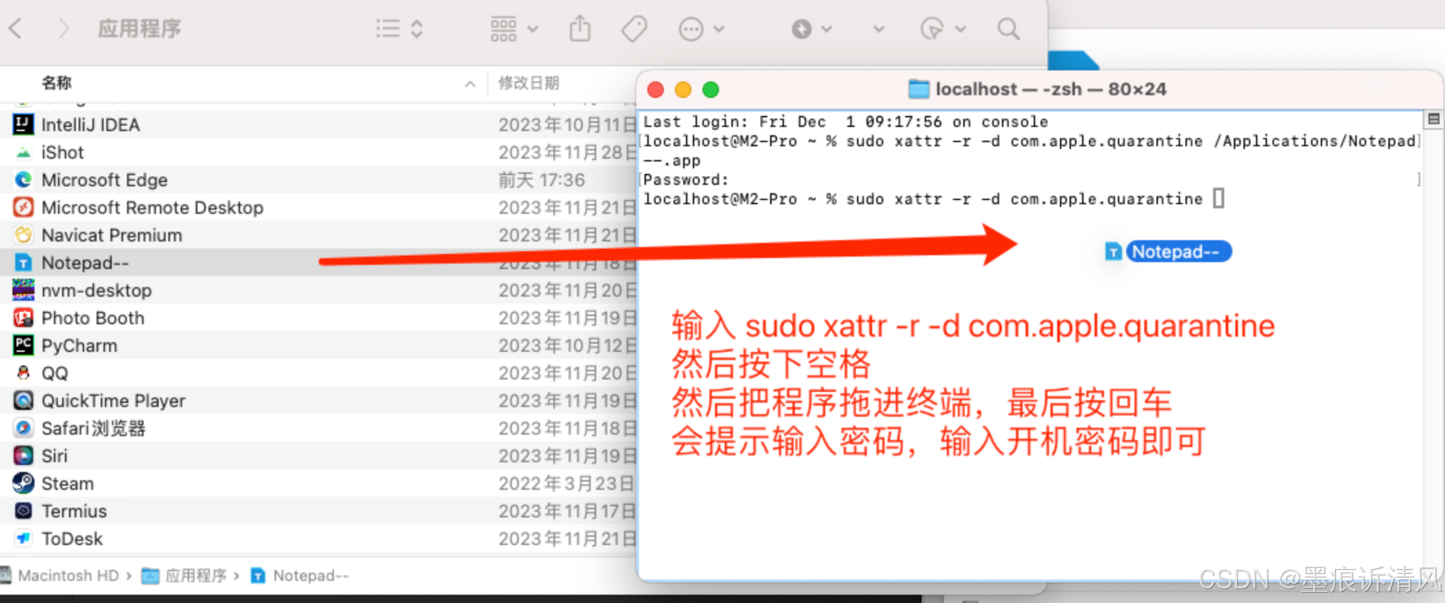 打开终端输入以下代码,空格一个,把应用程序中的Nodepad--拖进去回车并输入开机密码(密码不可见)。