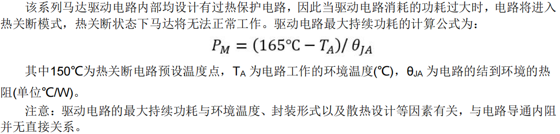 - 核算电机工作电流是否持续超过芯片最大持续电流能力。