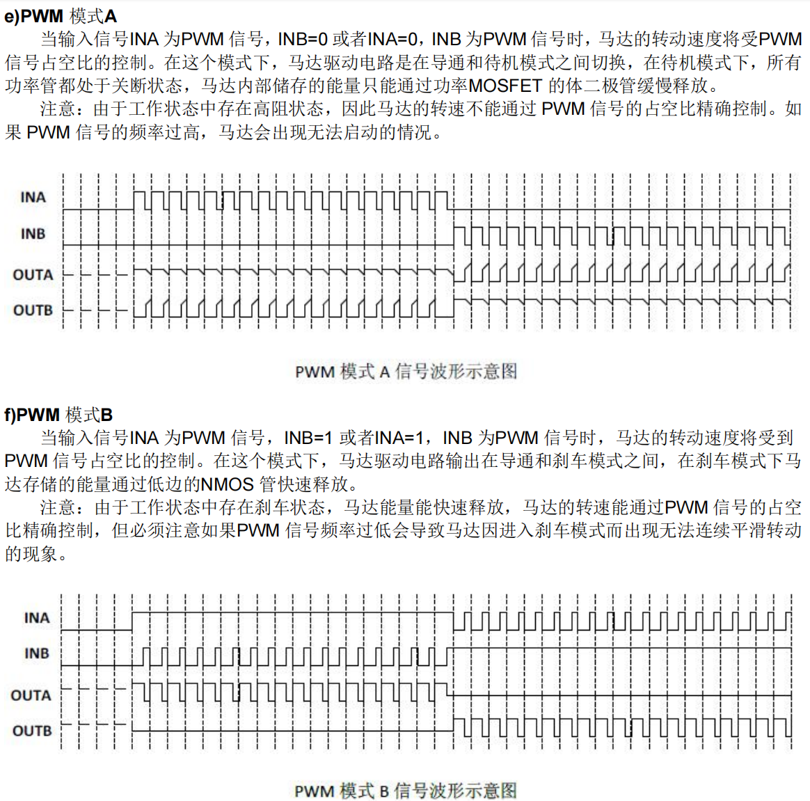 - 反转模式(0,1):OUTB为高,OUTA为低,电流从B流向A。