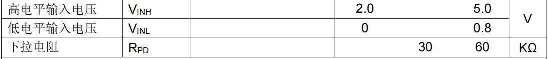 - 低电平阈值:<0.8V,内置30kΩ--60kΩ下拉电阻