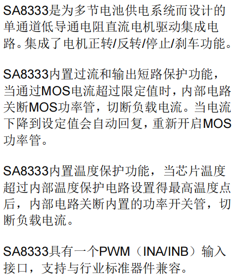 SA8333 是一款专为多节电池供电系统设计的单通道直流电机全桥驱动 芯片,集成低导通电阻功率MOS与完善保护机制 ,提供正转、反转、刹车、停止 四种工作模式,适用于智能硬件、电子锁等高集成度电机控制场景。