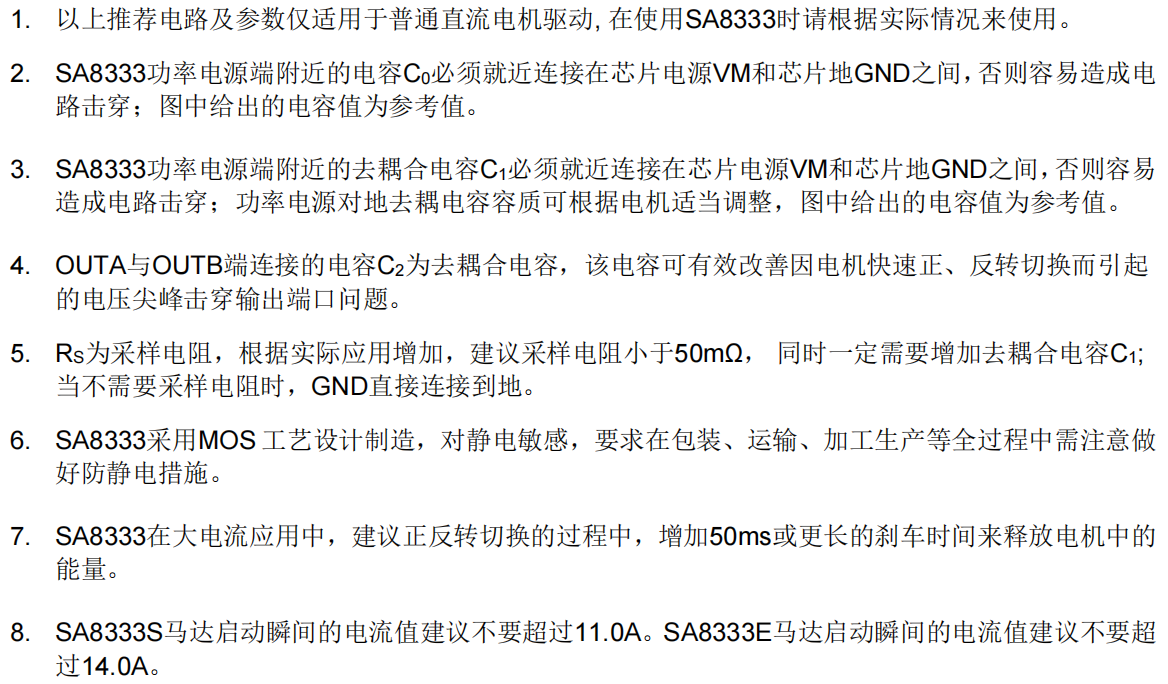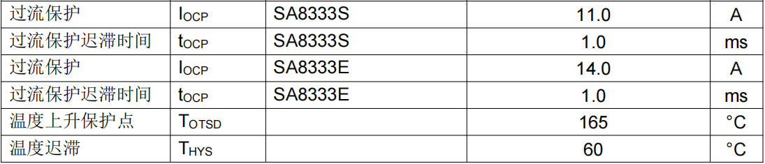 - 过流保护阈值:SA8333S为11.0A,SA8333E为14.0A 响应时间约1ms,逐周期限流,防止堵转损坏。