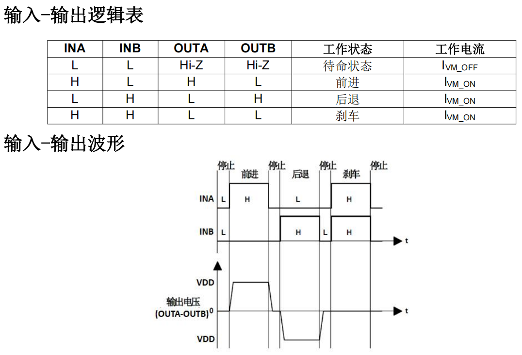 - 停止模式(0,0):输出高阻,电机自由停止,芯片进入微安级待机。