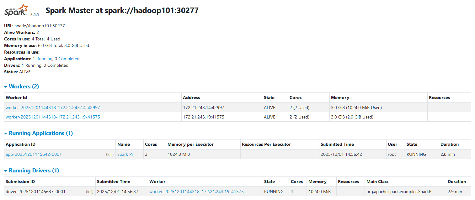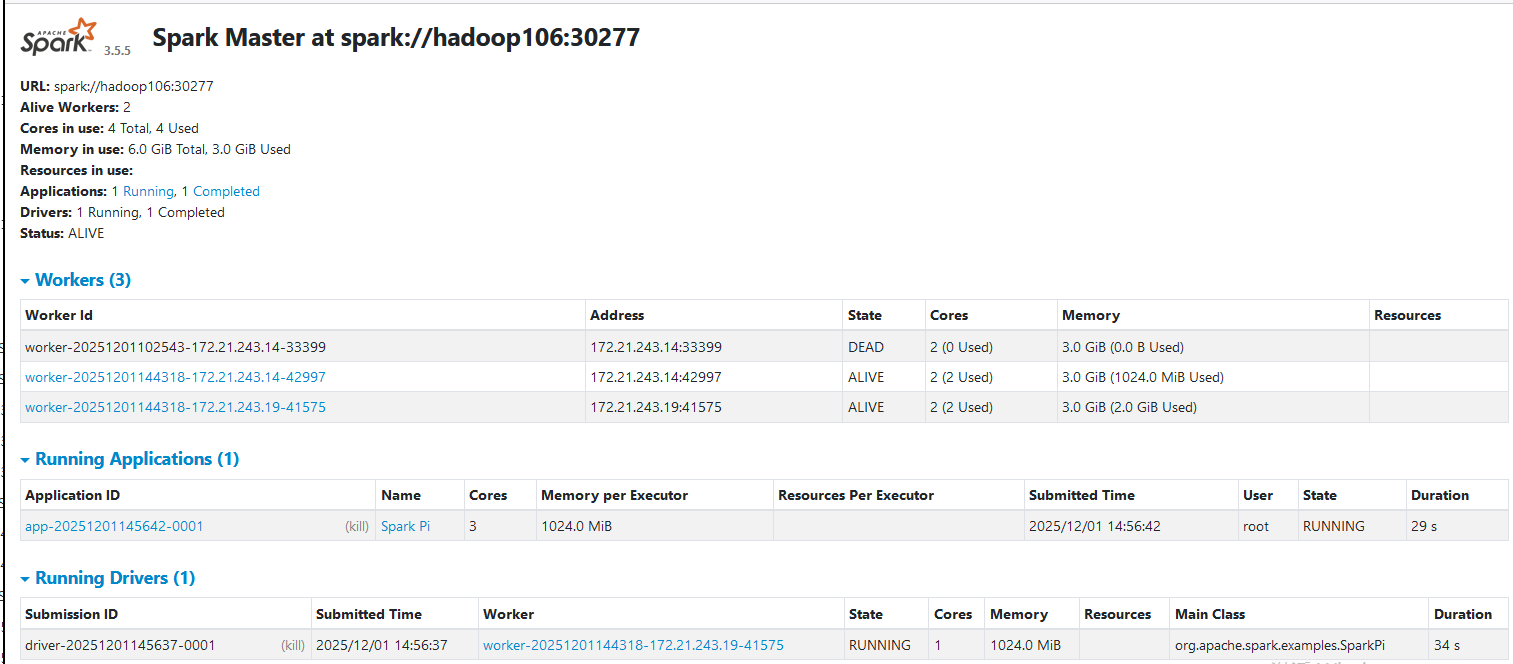 spark-submit --master spark://hadoop106:30277,hadoop101:30277 --deploy-mode cluster --supervise --class org.apache.spark.examples.SparkPi /opt/module/spark-3.5.5/examples/jars/spark-examples_2.13-3.5.5.jar 20000