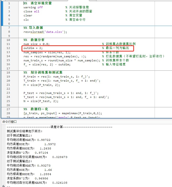 最后给伸手党指条明路:替换数据时切记保持excel格式,输入输出连续存放。比如你的数据是12输入5输出,就把excel前12列作为输入,后5列作为输出,然后在main.m里把outdim=5改好。运行报错十有八九是数据维度没对齐,重点检查xlsread后的矩阵尺寸。