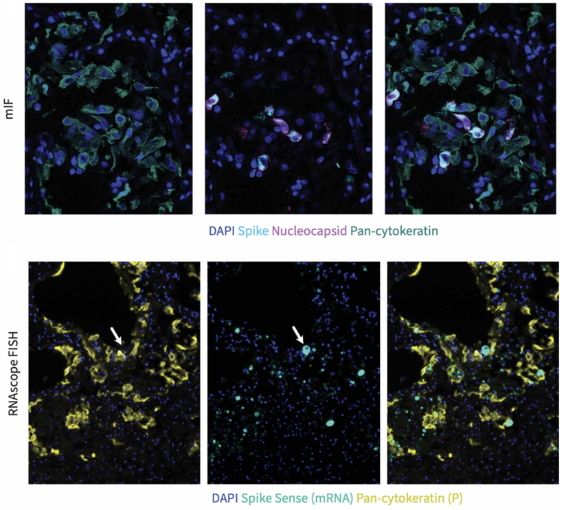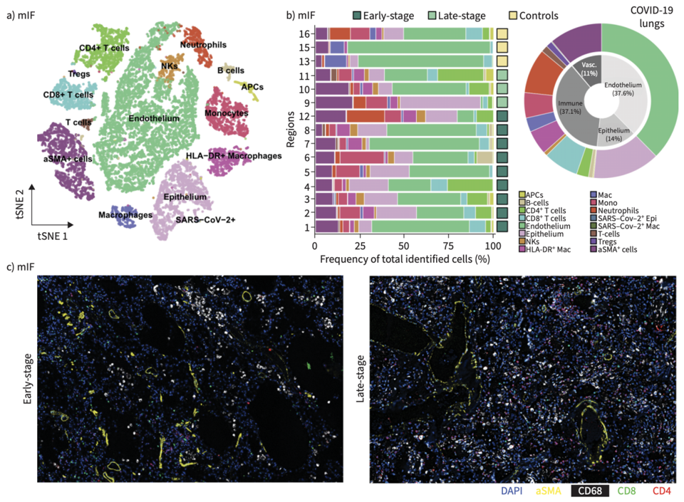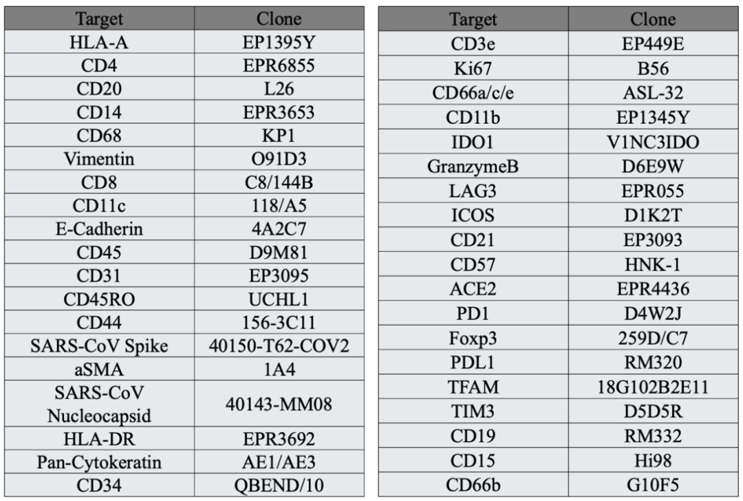 组织样本包括了8例COVID-19尸检肺组织(早期3例和晚期5例),以及8例对照样本(5例非呼吸道死亡、1例细菌性肺炎、1例鼻病毒肺炎和1例MERS肺炎)。研究对组织样本进行了空间转录组,以及PCF 空间单细胞蛋白组检测。PCF总共检测了38种抗体,包括了SARS-CoV-2蛋白Spike和Nucleocapsid的抗体。
