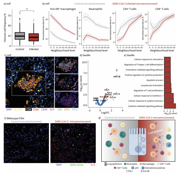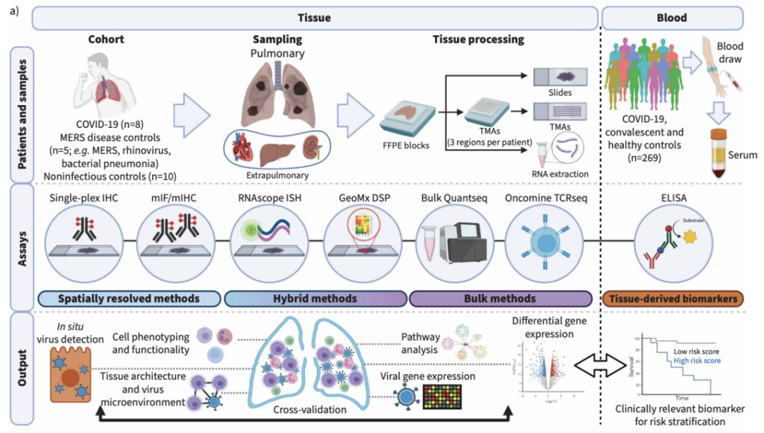 COVID-19虽以呼吸系统感染为主,但对肺组织内免疫反应及细胞外基质(ECM)在疾病进展中的作用缺乏系统研究。多数研究集中于血液或支气管肺泡灌洗液样本,无法全面反映肺内空间免疫病理特征。此外,关于SARS-CoV-2感染的细胞类型、病毒微环境特征及胶原沉积的临床意义存在争议。近期,国际呼吸领域的权威期刊《Eur Respir J》(IF:21)发表了一项题为"Multi-omic spatial profiling reveals the unique SARS-CoV-2 lung microenvironment and collagen VI as a predictive biomarker in severe COVID-19"的论文。该研究通过P hen oCycler-Fusion ( PCF )空间单细胞蛋白组、GeoMX DSP空间转录组、多重免疫荧光和bulk转录组等多组学分析技术深入探索了重症COVID-19患者肺组织的免疫微环境及细胞外基质变化,并发现胶原蛋白VI(COL6)可作为预测疾病严重程度的生物标志物。